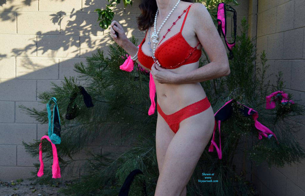 I was dressed in my pretty little red bra and thong for xmas. It was time to take down my tree now that the season was over. My ex took all the xmas decorations when we got divorced so I used my lingierie to decorate my tree. Anyway xmas is over so I was just taking it down and pulling off all my colorful little bras, thongs and thigh highs and putting some on and modeling them for you. I think you might like it better when I have nothing on at all. so check it out. I love showing off my little pussy for the camera as well as my soft all natural tits.